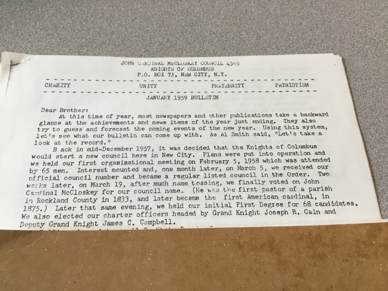 Here are some facts and illustrations of the history of The John Cardinal McCloskey Council. The first meeting was on February 5,1958 at StAugustines Church,New City.It Was attended by 65 men.The first Grand Knight was Joseph Cain, the Deputy Grand Knight was James Campbell and the Chaplain was Fr.Markowski.